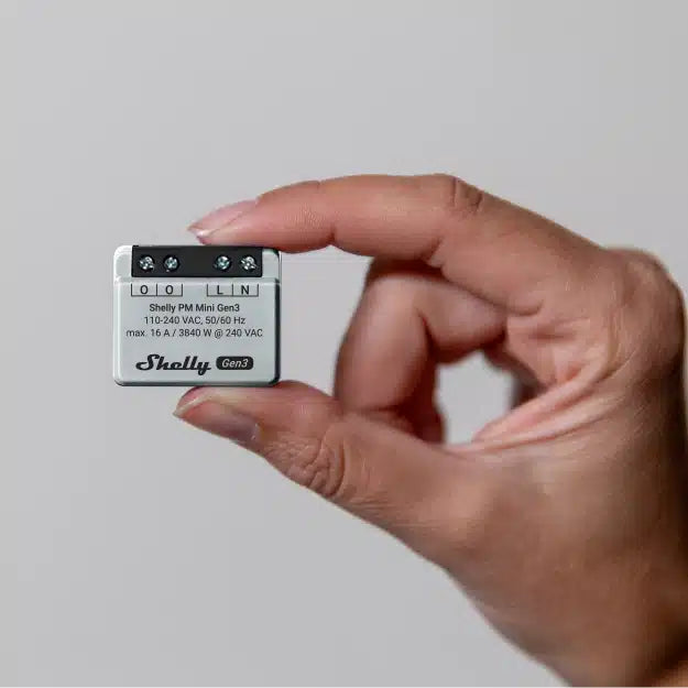 The Shelly PM Mini Gen3 Power Meter is an ultra-compact smart energy monitoring module designed to measure electricity consumption in real time. Installed behind wall sockets, switches, or electrical boxes, the device allows users to track power usage of connected appliances and circuits through the Shelly Smart Control platform.